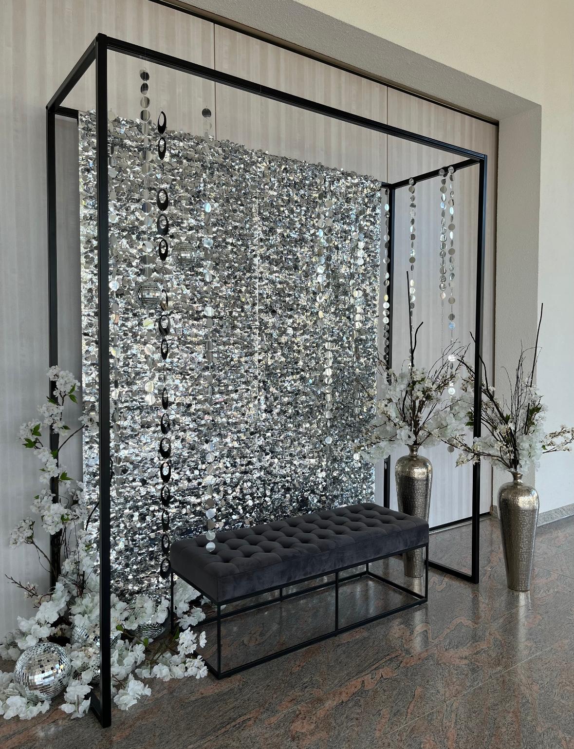 Lieferumfang: Rahmen in Schwarz. Silberne oder weiße Stanzoptikfolie. Sitzbank. (Floristik muss separat gebucht werden.)